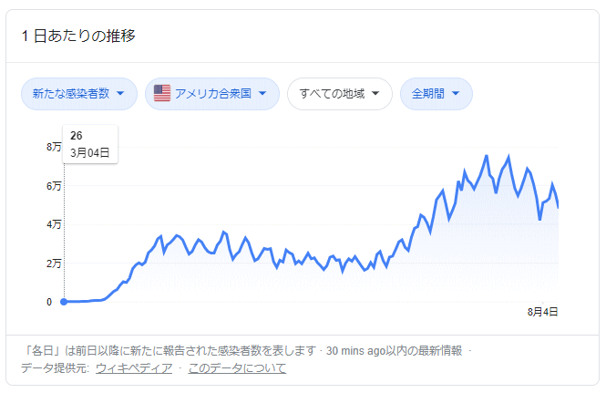 一方で、国全体を見た場合ではアメリカでは現在1日あたり4万人近い新規感染者がでているものの7月末以降減少傾向が続いています。一方、日本は1日あたり1000~2000人となっておりアメリカよりも大幅に低い数値です。