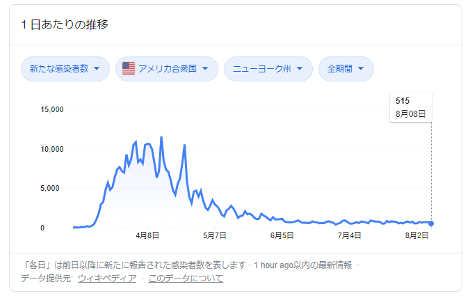 東京都の人口は1300万人、ニューヨーク州は1945万人という差はあるものの、1日あたりの新規感染者で比較すると8月8日における新規感染者数は東京都が429人、ニューヨーク州が515人と僅差になっています。