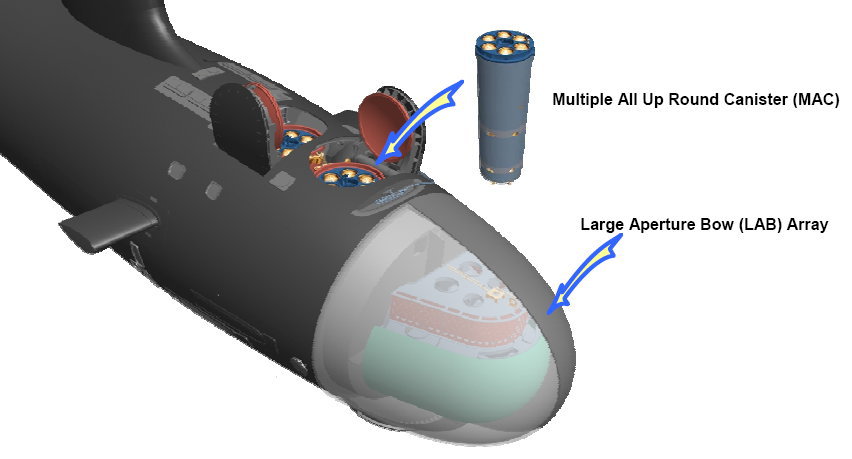 記事によると、今回発表されたのはPVLSにこれを収めるのではなく、2門の62口径155mm単装砲を撤去し、アメリカの原子力潜水艦で運用されている従来型の複数円形収納筒(Multiple All-up-round Canisters、MAC)に置き換える予定だというものです。