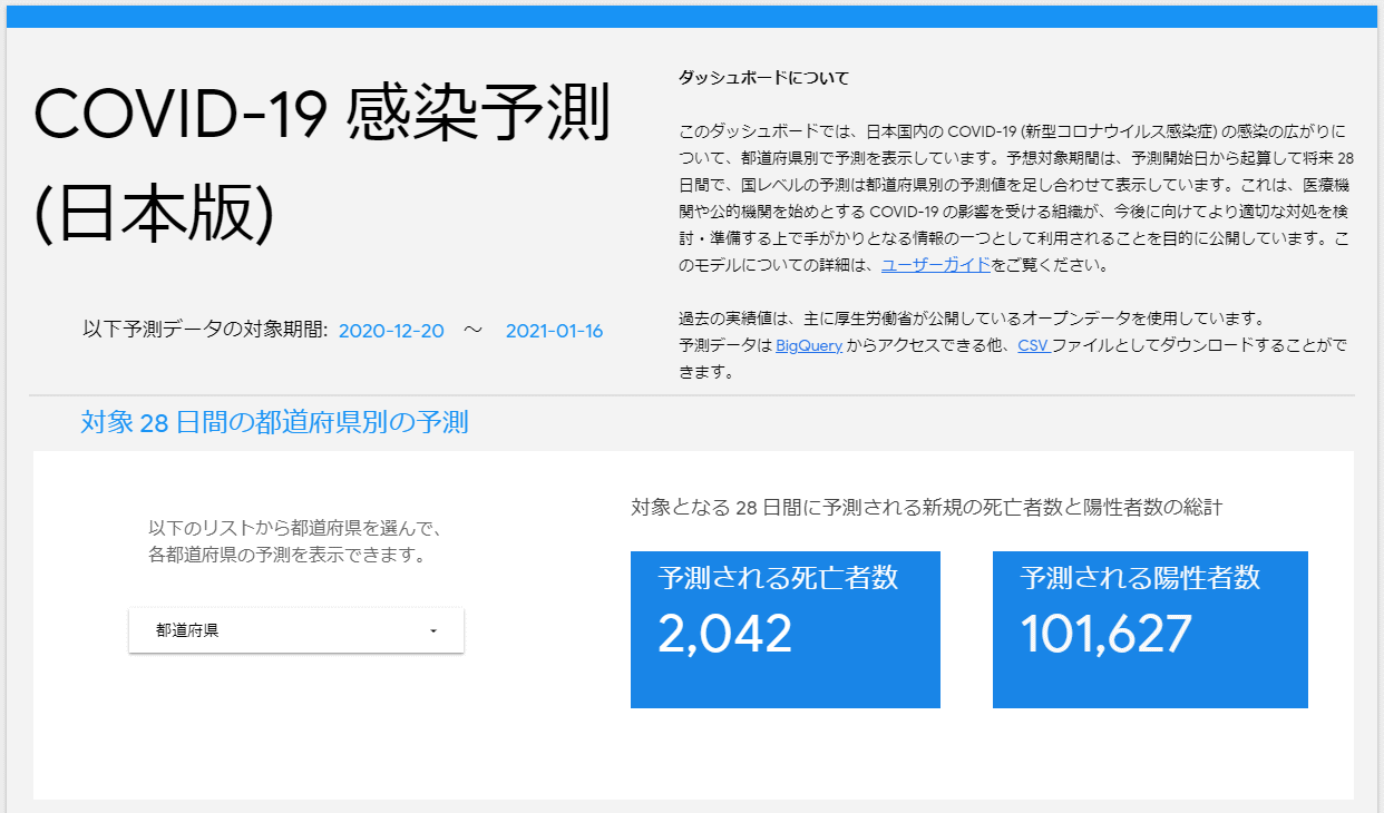 2020年12月22日現在、日本では1日あたりの感染者が2000人前後、死者数も40~50人という日もあるのですが、11月17日にGoogleが日本向けとして公開したのは『COVID-19 Public Forecasts』という新型コロナウイルスの感染状況など将来を予測するというGoogle Cloud AIによる技術です。
