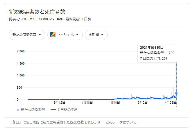 ブルームバーグ、ウォールストリートジャーナル(WSJ)が今月10日報じた内容としてインド洋に浮かぶ島国、セーシェル共和国で新型コロナウイルスが急増しており、人口あたりに新規感染者数がインドをこえていると報じられています。
