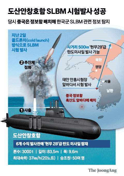 一方、中国は試験発射前の数日前に黒山島沖東経124度線付近に艦艇を派遣。韓国軍関係者によると「潜水艦発射弾道ミサイルの動向を監視し情報収集に乗り出したのではないか」と述べています。この艦艇はこれまでも韓国や日本、また米海軍との軍事演習時にも出現しており追跡するということを行っています。