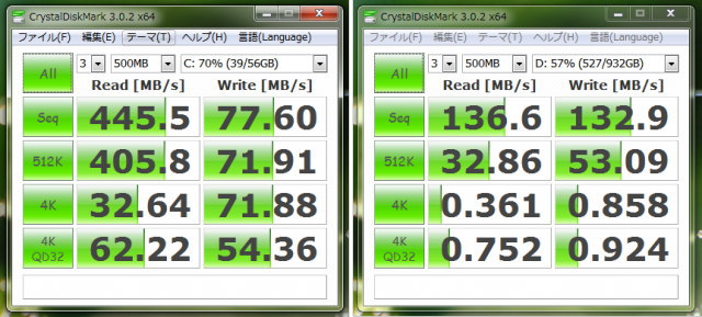 左がSSD、右がHDDのベンチマーク結果です。見ての通りRAMディスクに比べると圧倒的に遅いということがわかります。