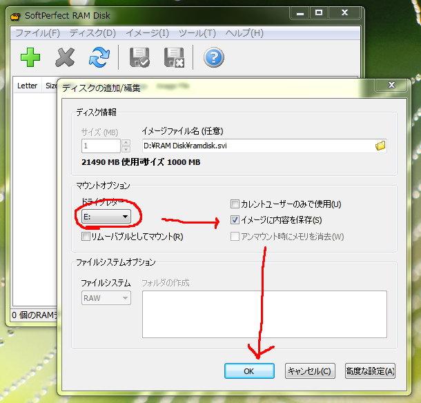 「サイズ」は消えないRAMディスクの容量、「ファイルシステム」はNTFS(Windows7)、「ボリュームラベル」はマイコンピューターで表示されるラベルなのでわかりやすく「RAM Disk」としました。設定が終われば「OK」をクリックします。(作成されるまで時間がかかる場合があります。)