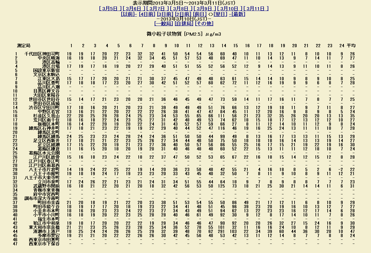 異常な数値が観測されたのは2013年3月10日、東京都清瀬市上清戸の観測局で午後2時の段階で最高の291μg/m3。また他の地域でも午後2時の段階で杉並区久我山111μg/m3、練馬区石神井町116μg/m3、武蔵野市関前125μg/m3、東大和市奈良橋101μg/m3となっており、各地で煙霧と共にpm2.5が大量に舞い上がっていた事が分かりました。