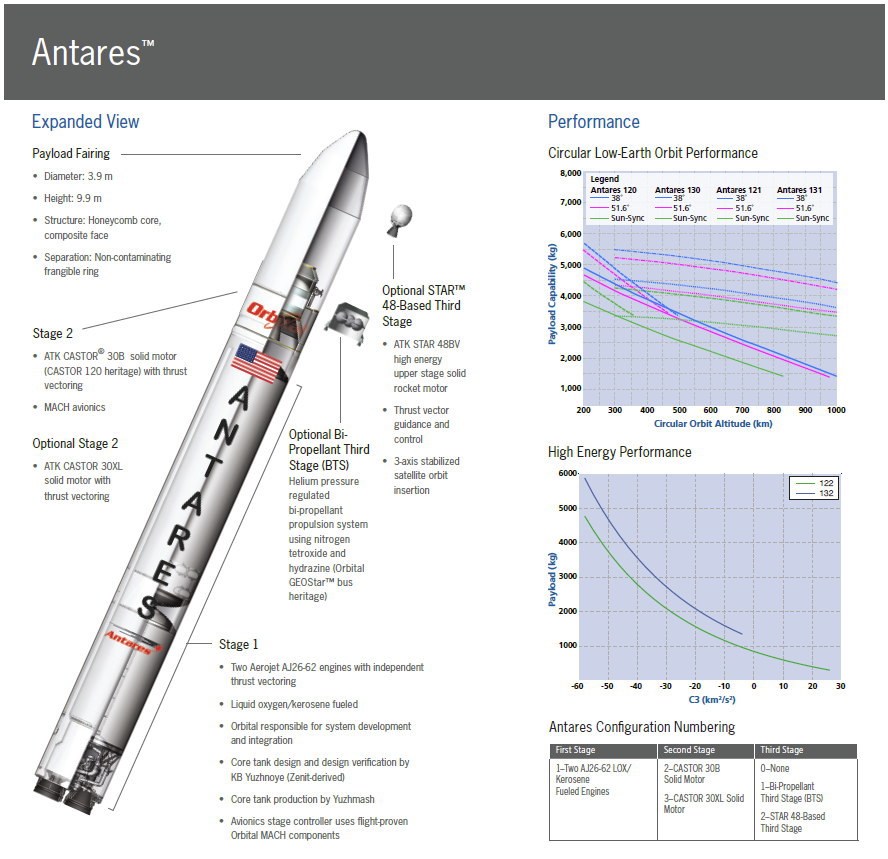 アンタレスロケットの打ち上げ能力は静止トランスファ軌道に2,400kg、ISS軌道に約5トンとなっています。同ロケットは当初2011年10月に打ち上げが予定されていたものの9回ほど延期され今回の打ち上げに至っています。
