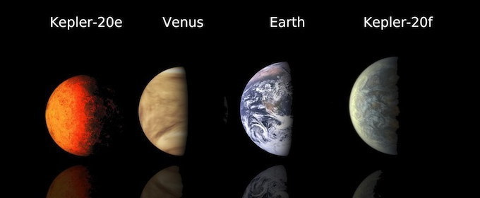 金星と地球とKepler-20e(左)、Kepler-20f(右)のサイズを比較した想像図。