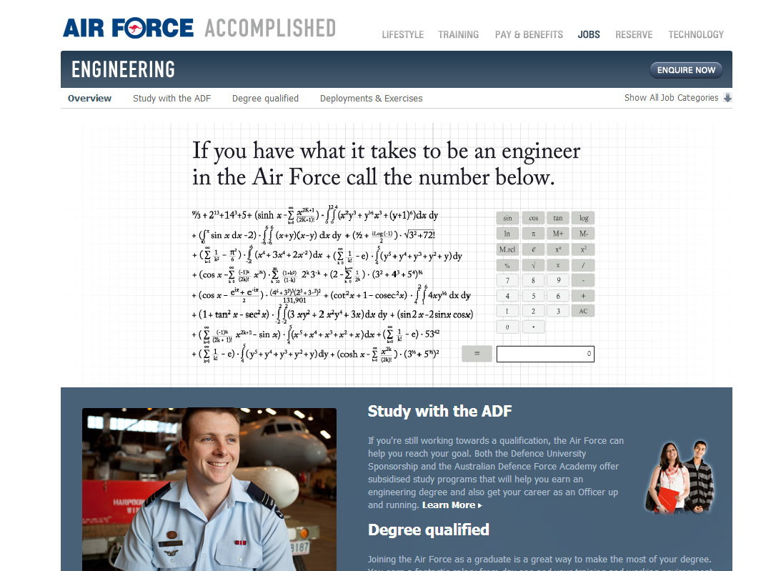 問題の求人が掲載されていたのはオーストラリア空軍の公式サイト。空軍には9種類の職種がありそのうち、エンジニアリングのページに掲載されていました。このページには仕事の説明は一切なく、「あなたが空軍でエンジニアとして必要なものを持っているなら、下記の番号に電話を」という文言のみが掲載されていました。もちろん電話番号は掲載されておらず、複数の数式を解いた人のみ電話番号を知ることができるという仕組みになっていました。