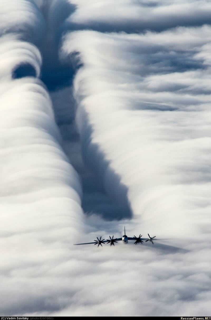 1956年より現在のロシアで運用されているTu-95は、ターボプロップエンジンを4基搭載した長距離戦略爆撃機です。外観は大きく後ろに下がった後退翼、スマートなボディー、そして8枚のプロペラが前後で逆に回転する二重反転プロペラが特徴です。プロペラは約750〜800回転/分で回転し、独特の轟音を発しながら飛行します。