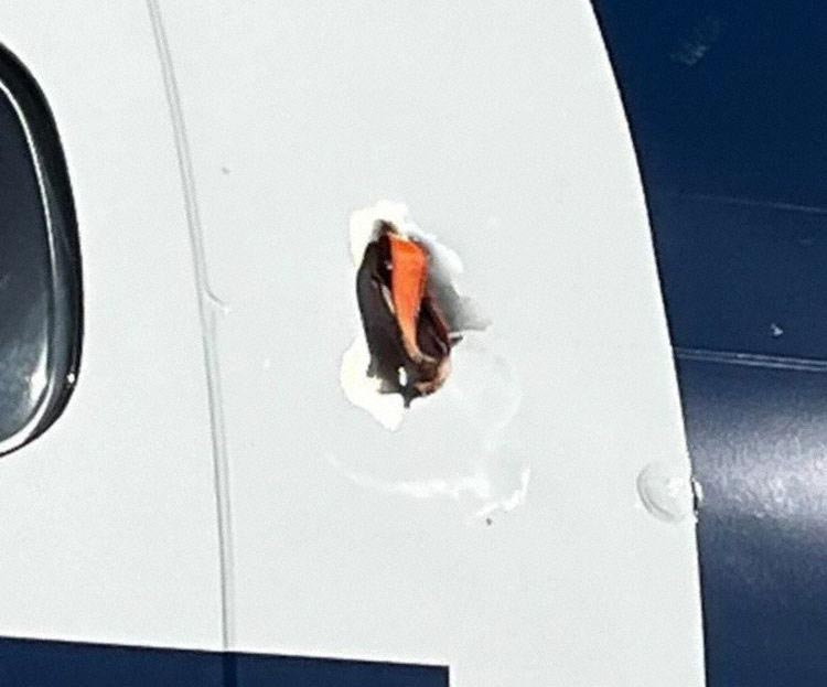 そしてこちらが外からみた写真。機体にパックリと貫通した痕跡が残っています。