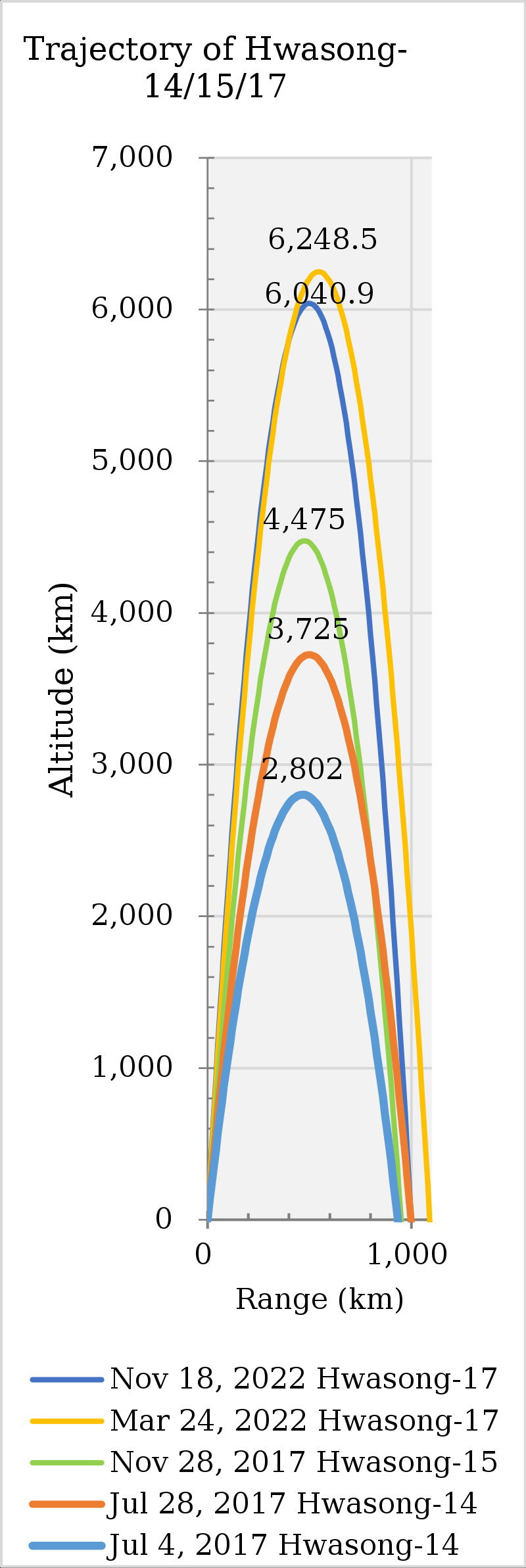 過去に発射した火星15(緑)と火星17(黄色・青)のロフテッド軌道による最大到達高度です。このように火星15に関しては4400km程度だったのに対し、火星17は6000~6200kmとなっています。ちなみに国際宇宙ステーションが周回しているのは高度400km程度です。