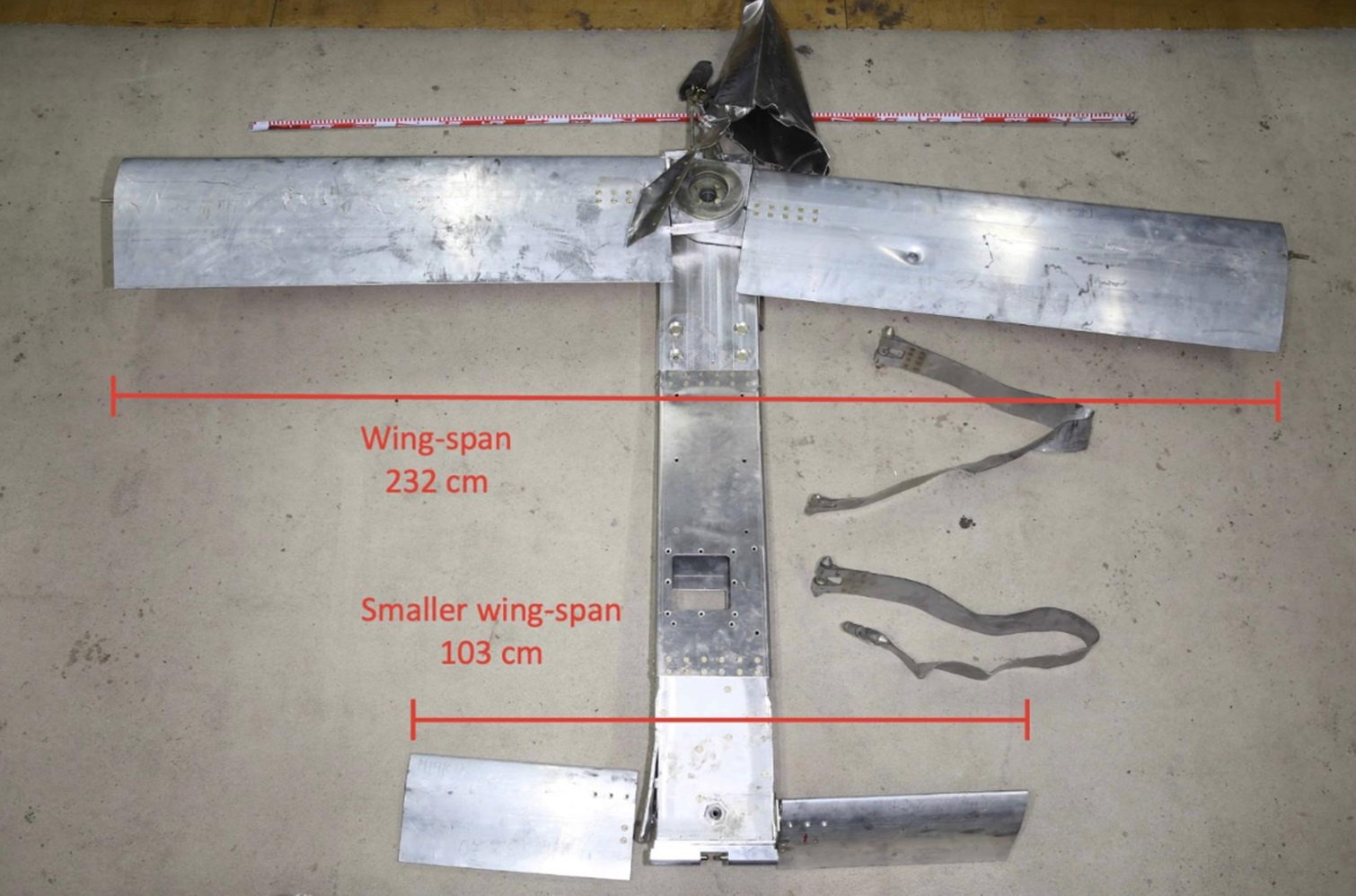 ウクライナによるとこのUMPKは2023年初頭から使われはじめたとしているのですが、2023年5 月と11 月に回収されたUMPKキットからいくつか興味深いものがわかりつつあります。まず全体的なサイズについては主翼は2m32cmあり後部の尾翼は103cmです。全体の長さは記載がなく不明ですが2メートル程度はあります。