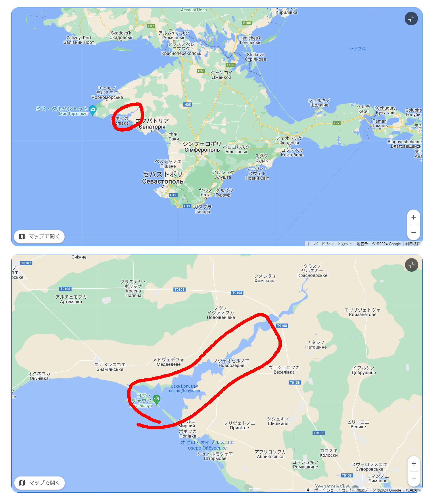 こちらがドヌズラフ湖になるのですが海に出るには細い岸の抜け目を通過する必要があります。ウクライナの無人艇はこの細い抜け目を通過し内部に侵入し攻撃したことになります。