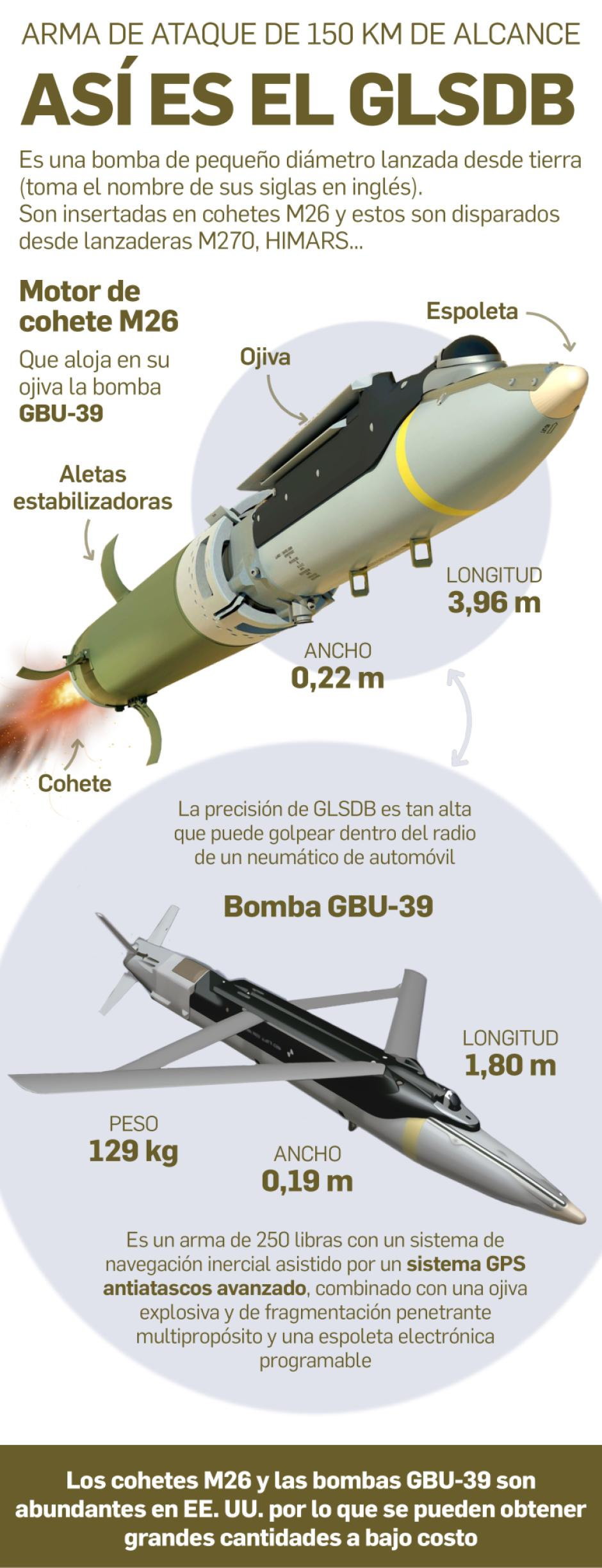 このGLSDBは地上のミサイルランチャーからロケットモーターにより射出されます。GLSDBは2015年にアメリカでも配備されたばかりの最新兵器で1発あたり40,000 ドル相当の戦闘機などが投下する精密誘導型GBU-39/B SDB小径爆弾にM26ロケットを接続したものになります。