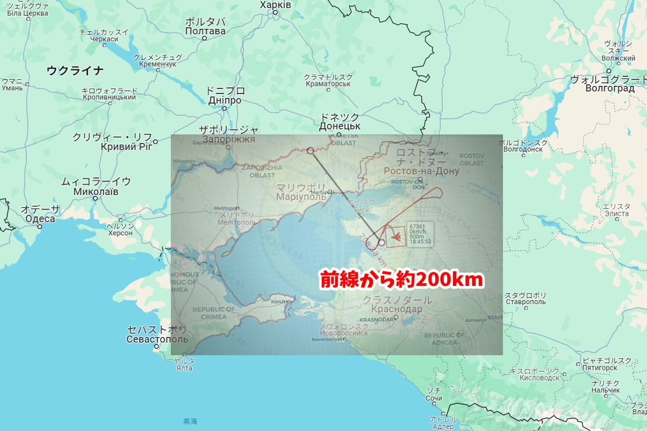 こちらの画像とグーグルマップの画像を目安で重ねると撃墜したのは前線から約200kmも離れた位置にある点です。