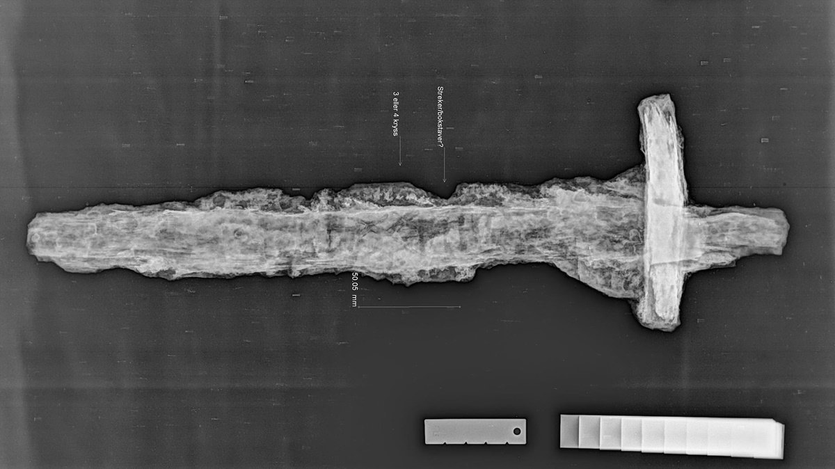 その後、調査に乗り出した現地専門家らはこの短刀がバイキング時代(793~1066年)の鉄剣であることを確認しました。X線で剣をスキャンした結果、十字形パターンのあるフレーズの輪郭が現れ刃に文字の跡も現れたことから間違いないとしています。